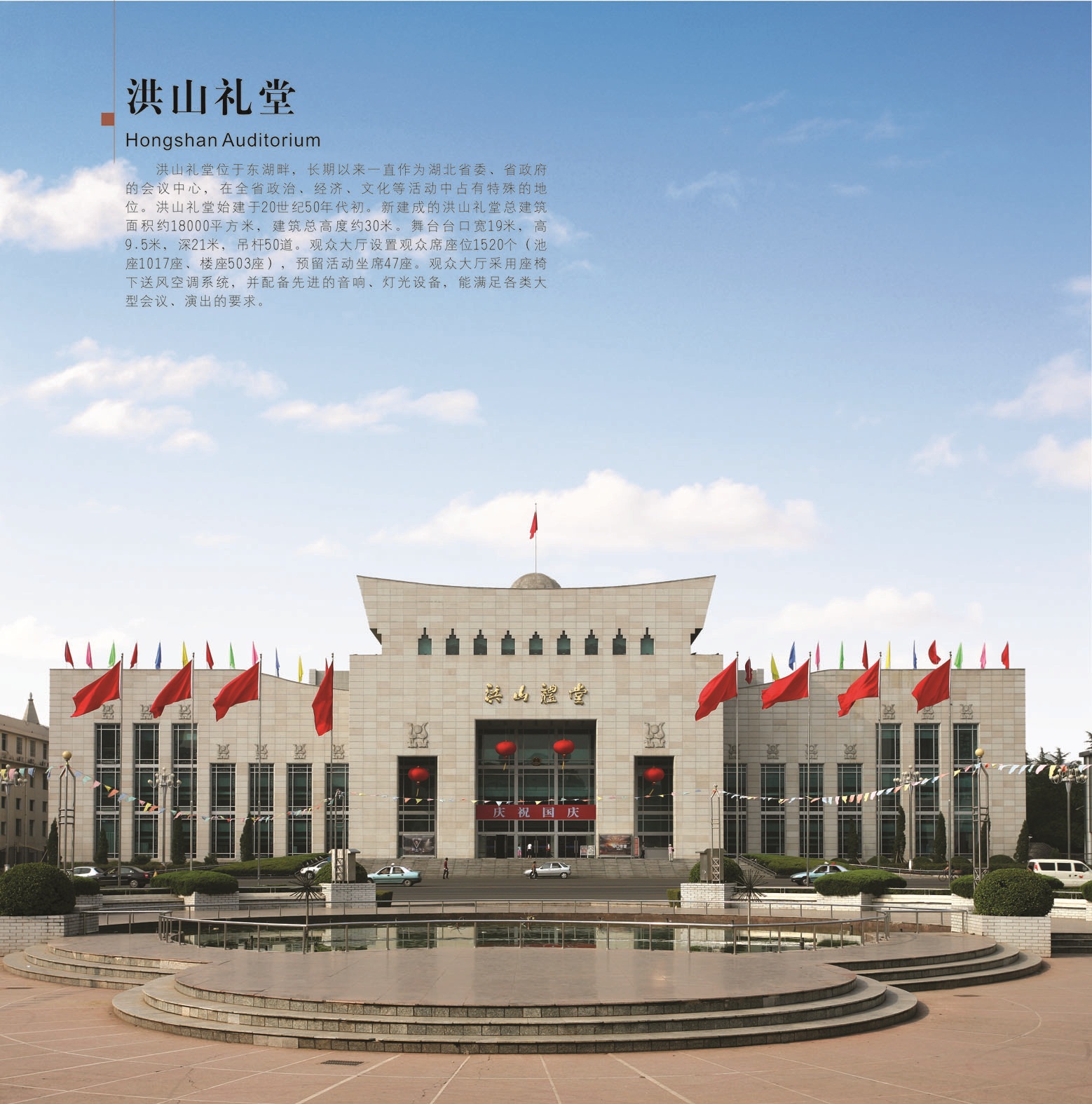 洪山礼堂位于东湖畔,长期以来一直作为湖北省委、省政府的会议中心,在全省政治、经济、文化等活动中占有特殊的地位。洪山礼堂始建于20世纪50年代初。新建成的洪山礼堂总建筑面积约18000平方米,建筑总高度约30米。舞台台口宽19米,高9.5米,深21米,吊杆50道。观众大厅设置观众席座位1520个(池座1017座、楼座503座),预留活动坐席47座。观众大厅采用座椅下送风空调系统,并配备先进的音响、灯光设备,能满足各类大型会议、演出的要求。